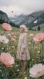Cinematic dreamy meadow scene in the mountains. A young woman stands among tall blooming flowers and poses calmly to the camera. Her hair moves softly in the wind, and her light dress gently flows and ripples with the breeze. Around her, the flowers and meadow grass sway naturally in the wind, creating a soft living motion across the whole field. A butterfly flies gracefully around the woman, passing near her head and shoulders before drifting through the flowers. Soft cloudy mountain background, delicate petals floating in the air, poetic natural atmosphere, ultra detailed floral textures, gentle wind movement, cinematic composition, romantic fairytale mood, natural elegant lighting, film look.