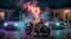 Cinematic surreal night scene in a suburban driveway with neon reflections and moody atmospheric lighting. A person stands confidently beside a sleek white sport motorcycle, posing with a calm, powerful posture while their head is entirely engulfed in vivid living fire. The flames burn continuously and intensely, rising upward in dynamic shapes with glowing orange, red, and magenta tones, while sparks and tiny embers drift through the air. Thick smoke curls and flows around the figure, spreading outward and upward in soft swirling motion, partially wrapping around the body, the motorcycle, and the parked cars in the background. The person remains mostly still, striking a strong fashion-like pose with an otherworldly fiery head. Ultra detailed fire simulation, realistic smoke motion, glossy reflections on the wet ground, dramatic surreal atmosphere, cinematic composition, high contrast lighting, modern supernatural aesthetic, film look.