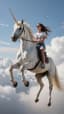 Cinematic fantasy scene high above the clouds. A young woman rides a majestic white unicorn flying through the open sky. The unicorn moves gracefully forward through soft bright clouds, its mane and tail flowing in the wind, horn glowing subtly in the sunlight. The woman sits confidently on its back, her hair and clothes blowing naturally in the air. The sky is wide and luminous, with dreamy sun rays and soft cloud depth all around. Magical, elegant, uplifting atmosphere, realistic motion, detailed fur and hair movement, cinematic lighting, ultra realistic, fantasy adventure aesthetic, smooth flying motion, epic and beautiful.