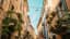 A cinematic static upward-looking shot in a charming narrow European street lined with old pastel buildings, stone facades, green shutters, wrought-iron balconies, and overflowing flower boxes with soft pink and white blossoms. The camera remains completely still, pointed toward the open strip of blue sky above the street. A passenger airplane slowly flies across the sky overhead, passing through the center of the frame with smooth natural motion. Its contrails stretch behind it in soft pastel pink and lavender tones, leaving a dreamy streak across the blue sky. The buildings, balconies, flowers, and hanging wires remain still, while only the airplane moves through the scene. Warm sunlight, romantic Mediterranean atmosphere, photorealistic, highly detailed, cinematic 4K.