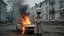 Cinematic static shot in an empty courtyard between old apartment buildings on a cold grey day. A woman wearing a cracked white rabbit mask stands perfectly still in the foreground with hands clasped. Her long dress gently flutters in the wind, subtle fabric motion. Behind her, an old car is fully on fire, bright flames and embers, sending a thick column of dark smoke straight upward. The woman remains motionless and calm while the environment moves: smoke rising, fire flickering, small ash particles drifting. Camera is locked off (no movement), centered composition, moody atmosphere, realistic fire and smoke simulation, natural wind on fabric, shallow depth of field, film look, high detail, dramatic lighting, ultra realistic.