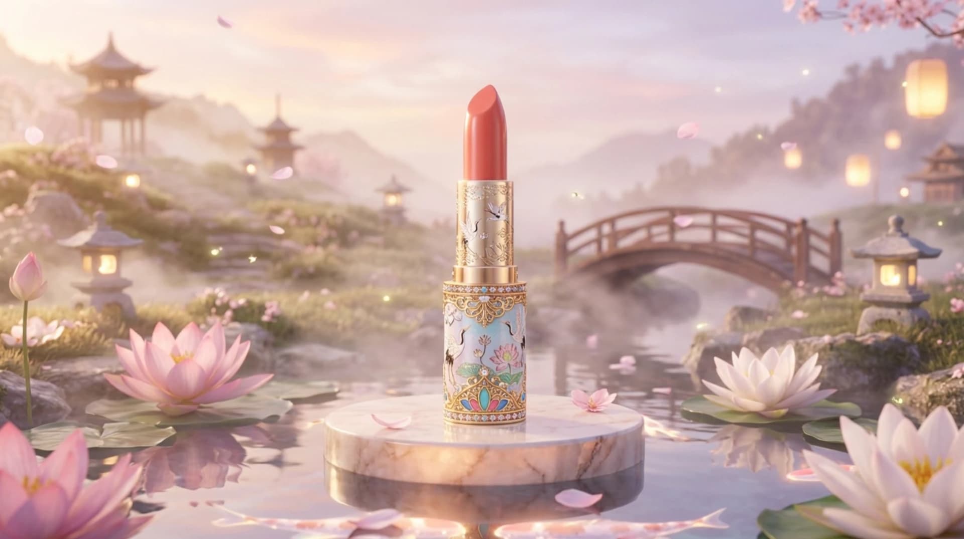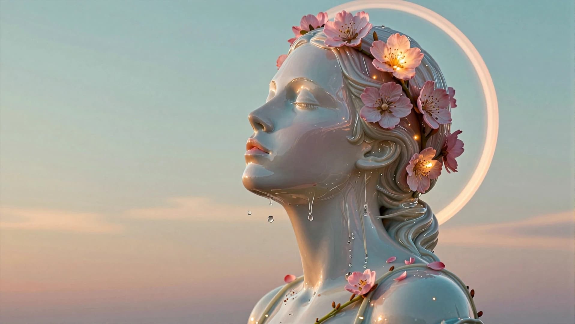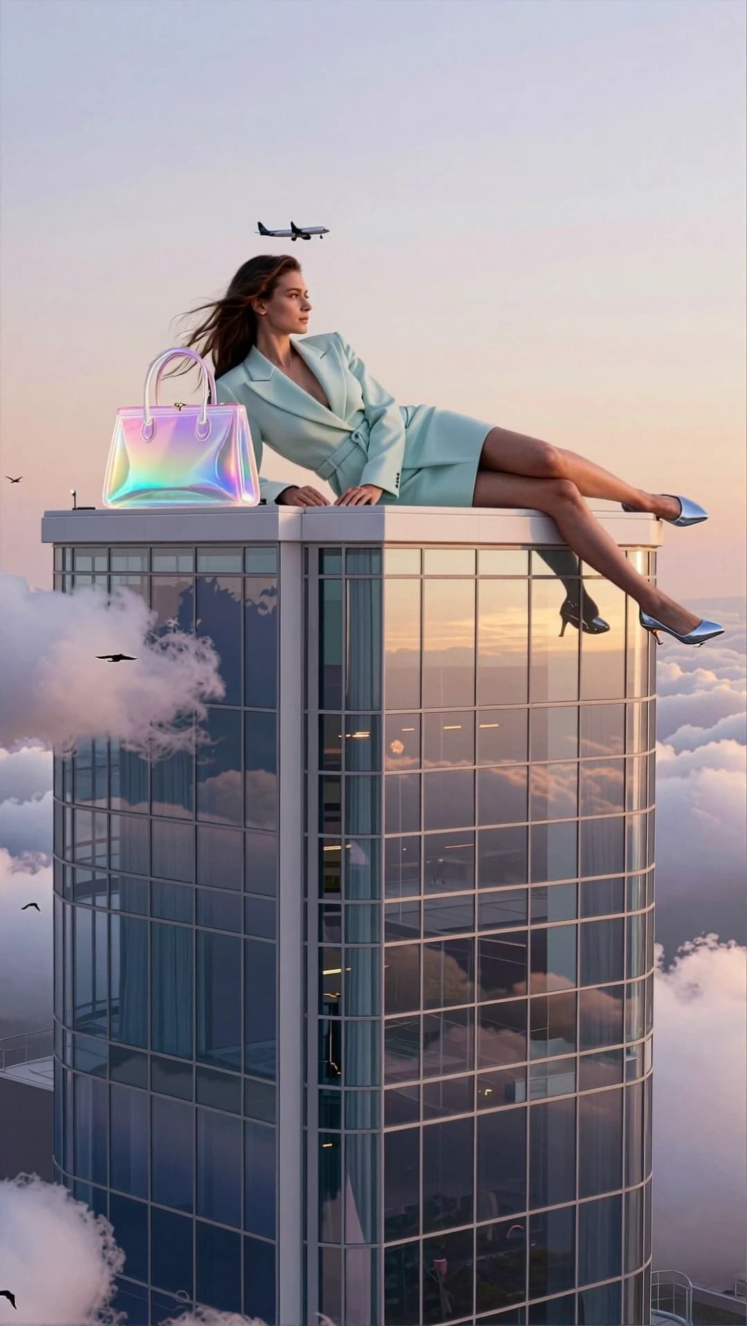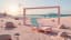 Cinematic pastel surreal beach scene at golden sunlight. A minimalist pink desert-like shoreline with soft sand dunes, smooth round stones, a modern lounge chair, and a large rectangular frame facing the ocean. The camera slowly moves to the left, creating gentle parallax between the foreground sand, stones, lounge chair, and the open frame. In the background, the sea rolls with soft natural waves, and the ocean surface shimmers under warm sunlight. The atmosphere is calm, airy, and dreamlike, with clean pastel colors, soft shadows, and elegant minimalist composition. Ultra detailed sand texture, subtle wave motion, serene coastal mood, surreal design aesthetic, cinematic lighting, smooth leftward camera move, film look.