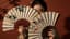 Cinematic elegant portrait of a young woman in traditional Asian styling, holding two large decorative folding fans in front of her face. She slowly and gracefully moves the fans, unfolding and shifting them with delicate hand motion, revealing parts of her face and eyes in a refined, controlled pose. Her gaze stays calm and intense, directed toward the camera. Warm soft lighting, rich red background, subtle shadows of bamboo leaves, high detail, graceful fashion editorial aesthetic. The camera slowly pushes in toward the woman, creating an intimate cinematic close-up. Smooth motion, realistic hand and fan movement, luxurious atmosphere, ultra detailed, film look.