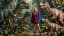 Cinematic jungle fashion scene. A stylish young woman stands perfectly still in the center of the frame, posing confidently, calm expression, subtle breathing only. Around her, several realistic dinosaurs (raptor-like) stand close, turning their heads slowly, scanning the surroundings, blinking naturally, slight nostril movement and subtle jaw/tail micro-motions. Lush tropical rainforest background with big leaves and vines, soft sunbeams through canopy, light fog and floating dust particles. The woman remains motionless while the dinosaurs animate gently. Realistic skin and scale textures, high detail, cinematic lighting, shallow depth of field, film look, smooth natural motion, ultra realistic.