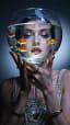 A surreal cinematic beauty portrait. A young woman holds a round glass fishbowl directly in front of her face, posing gracefully and looking through the bowl toward the camera. Inside the fishbowl, several small goldfish swim slowly and naturally through the clear water. The woman remains elegant and almost motionless, with only subtle natural pose adjustments and soft facial expression. The fish move gently in different directions, creating delicate motion inside the glass. The camera is completely static. Moody studio lighting, glossy reflections on the glass, soft skin highlights, luxurious editorial aesthetic, highly detailed, realistic water refraction, ultra realistic, artistic fashion photography look.