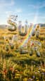 Cinematic sunny meadow scene filled with wildflowers. Transparent balloon letters spelling “SUMMER” float in the air above the field, gently hovering in place and making small natural movements, softly swaying and bobbing as if in a light breeze. Inside the clear balloon letters, tiny flowers, grass, and miniature summer plants are visible. Small butterflies and glowing pollen-like particles drift around them. A soft rainbow glows in the background over the flower field. The camera slowly slides a little to the left, creating a gentle parallax between the floating balloon letters and the meadow behind them. Warm golden daylight, vibrant floral landscape, dreamy summer atmosphere, ultra detailed transparent material, glossy reflections, whimsical magical mood, cinematic composition, smooth slow camera motion, film look.