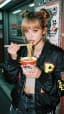 A stylish young woman eats noodles from a takeaway cup with chopsticks while standing on a city street. She occasionally looks directly into the camera and poses naturally, as if in a fashion shoot. The atmosphere is urban, youthful, and cinematic, with posters, storefront details, and soft neon lighting in the background. The camera performs a gentle slow zoom, bringing more attention to her face, expression, and the noodles. Realistic motion, subtle posing, natural blinking, soft movements, fashion editorial aesthetic, highly detailed, cinematic street photography look.