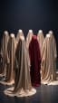 Cinematic surreal scene. A group of human figures completely covered in long flowing fabric slowly walk forward together in a quiet, eerie formation. Their movements are smooth, heavy, and ghostlike beneath the draped cloth. The fabric trails softly along the floor and shifts naturally with each step. One central figure is covered in deep dark red cloth, standing out among the others wrapped in pale beige fabric. The camera slowly tracks to the right, revealing the group from a changing side angle while maintaining the mysterious symmetry of the composition. Minimal dark studio background, soft directional lighting, subtle shadows, slow atmospheric motion, ultra detailed fabric folds, haunting elegant mood, cinematic art-house aesthetic, smooth motion, film look.