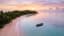 A dreamy aerial cinematic scene over a tropical island shoreline at sunset, with a smooth forward camera flight gliding above the pale pinkish sand and calm transparent turquoise water. The camera slowly moves forward along the curve of the coast, passing over the shallow sea and approaching the quiet wooden boat floating near the shore. The water is alive with gentle natural motion — soft ripples, subtle flowing surface patterns, tiny shifting reflections, and delicate wave movement near the beach. Dense tropical greenery lines the island, while the sky glows with warm pastel sunset tones of peach, pink, lavender, and soft gold. Peaceful, luxurious, serene atmosphere, elegant forward motion, photorealistic water movement, highly detailed, cinematic 4K.