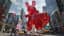 A giant translucent red gummy bunny rampaging through a city street, dramatic forward motion, one huge jelly paw moving toward the camera, elastic wobble in the gummy body, cars bouncing slightly, pedestrians running, debris shifting, strong cinematic motion blur, low-angle action shot, chaotic but readable composition, preserve the bunny design, realistic jelly physics.
