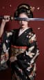 Cinematic portrait of a woman in an elegant black kimono with gold and floral patterns, standing against a deep red background and posing directly to the camera. She holds a katana horizontally in front of her face with one hand at first, then slowly raises her second hand and grips the katana with both hands in a controlled, graceful motion. Her expression is calm, intense, and composed, maintaining strong eye contact with the camera. Soft petals drift through the air around her. The camera remains completely static. Luxurious studio lighting, rich red backdrop, subtle fabric movement, realistic hand motion, glossy metal reflections on the blade, ultra detailed, dramatic fashion editorial aesthetic, cinematic stillness, film look.