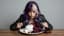 Cinematic surreal studio scene. A young woman with purple and white split-dyed hair sits at a table, staring directly into the camera with an intense, unblinking expression. In front of her, on a white plate, lies a mannequin head with vivid dark magenta hair like a strange served dish. Holding a fork in one hand and a knife in the other, she slowly cuts the mannequin’s hair in deliberate slicing motions while never breaking eye contact with the camera. The movement is controlled, eerie, and calm. The camera remains completely static. Clean neutral background, sharp studio lighting, glossy hair texture, subtle reflections on the plate and cutlery, surreal fashion-horror aesthetic, ultra detailed, cinematic composition, dark editorial mood.