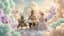 Dreamy surreal tea party scene floating among giant pastel clouds. A raccoon, a well-dressed man, and an elegant woman sit around a small ornate table and gently drink tea from delicate teacups. The raccoon carefully lifts its cup and sips in a charming, whimsical way, while the man and woman also calmly raise their cups and drink with graceful movements. Small birds flutter through the air around them. Several porcelain teacups levitate softly in the scene, slowly floating at different heights. The pastel clouds in the background continuously billow and drift, creating a living magical atmosphere. The camera slowly pushes in toward the table, moving closer to the characters and the tea set. Soft golden light, whimsical fantasy mood, ultra detailed, cinematic lighting, smooth elegant motion, dreamy surrealism, storybook luxury aesthetic.