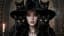 Cinematic gothic portrait in a dark, mysterious interior. A young woman wearing a black witch hat calmly poses and looks directly into the camera, remaining mostly still with subtle natural breathing and a composed expression. Several black cats sit closely around her, occasionally blinking their eyes and gently moving their ears. Thin curls of smoke drift through the air and slowly dissipate, creating a mystical atmosphere. A candle burns beside her with a soft, flickering flame that casts warm light on the scene. Ultra-detailed black fur, realistic cat eyes reflecting the candlelight, moody gothic lighting, subtle smoke movement, dark magical atmosphere, cinematic composition, shallow depth of field, high detail, witch aesthetic, film look. The camera remains completely static.