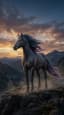A majestic dark silver-gray unicorn stands still on a rocky mountain peak at sunset, surrounded by dramatic distant mountains and a glowing sky filled with warm gold, peach, and dusky blue tones. The camera remains completely static. The unicorn gently blinks and slowly looks around from side to side with calm, noble, natural head movement, as if quietly observing the vast landscape. Its long flowing mane and tail stream continuously in the wind, moving softly and elegantly with layered strands catching the fading light. A faint mist drifts around the rocks near its hooves, and the horn glows subtly against the sky. The overall mood is magical, serene, and powerful, with realistic animal motion, graceful wind-blown hair movement, photorealistic, highly detailed, cinematic 4K.