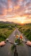A cinematic first-person view of a person riding a vintage bicycle down a narrow country road through rolling green hills at golden sunset. The viewer sees both hands holding the handlebars and a fresh bouquet of wildflowers fixed to the front of the bike, with daisies, poppies, grasses, and small blue blossoms gently moving in the wind. The bicycle moves steadily forward along the winding road, creating a smooth immersive POV sensation. Meadows blur softly at the edges from motion, small countryside houses and distant mountains appear ahead, and the warm sun glows near the horizon under a dramatic pastel-orange and pink sky. Natural forward motion, subtle handlebar vibration, flowers lightly swaying, dreamy rural atmosphere, photorealistic, highly detailed, cinematic 4K.