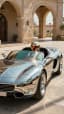 Cinematic luxury lifestyle scene in a sunny elegant courtyard. A stylish driver sits in a polished chrome vintage sports car and poses confidently to the camera for a brief moment, holding still with subtle head movement and composed body language. After the pose, the driver smoothly starts moving and drives away in the car with controlled elegant motion. The reflective body of the car catches sunlight and mirrors the architecture around it as it begins to roll forward and leave the frame. Warm daylight, premium atmosphere, glossy metal reflections, refined architecture in the background, ultra detailed car surfaces, cinematic composition, smooth realistic vehicle motion, luxury editorial aesthetic, film look.