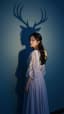 Cinematic surreal portrait. A young woman in a long delicate dress stands still near a wall and poses calmly to the camera with subtle natural movement — soft breathing, slight head turn, gentle eye movement. Behind her, her shadow appears transformed into a deer-like silhouette with elegant antlers and pointed ears, clearly visible on the wall. The woman remains graceful and human, while the shadow carries the mysterious animal form, creating a dreamlike двойственность. Moody blue lighting, strong contrast between the woman and her shadow, soft fabric texture, quiet magical atmosphere, ultra detailed, cinematic composition, surreal fantasy aesthetic, refined minimal background, film look.