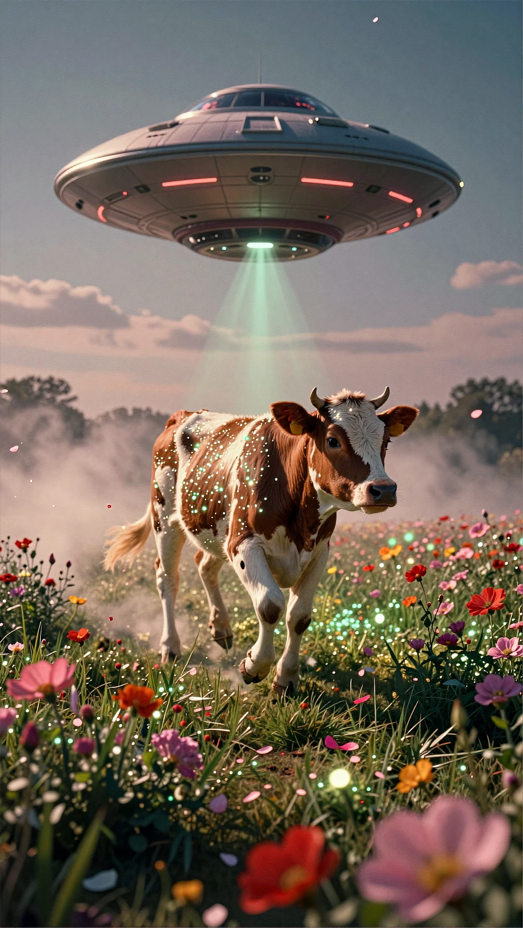 Cinematic surreal sci-fi meadow scene. A brown and white cow runs forward through a field of colorful wildflowers, moving naturally with energetic but smooth motion. Behind the cow, a classic metallic UFO flies low through the air, following her at a short distance. The UFO glides steadily, with soft glowing lights and a beam shining downward. In the background, smoke and mist drift across the field, moving with the wind and adding atmosphere. Small glowing particles sparkle around the scene. Warm sunset light, dreamy haze, detailed grass and flowers bending slightly, realistic animal motion, smooth UFO movement, cinematic lighting, ultra detailed, magical sci-fi realism, film look.