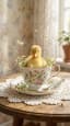 Cinematic cozy vintage interior, soft morning light through the window. A tiny fluffy yellow duckling sits inside an elegant porcelain teacup decorated with floral patterns, surrounded by small chamomile flowers. Light feathers slowly drift down through the air and land gently on the wooden table around the cup. The duckling looks around curiously, turning its head from side to side, glancing around the room with tiny natural movements and soft blinking. The camera slowly pushes in closer toward the duckling, making the moment feel intimate and charming. Warm pastel atmosphere, delicate lace tablecloth, realistic soft feather motion, ultra detailed fluffy texture, whimsical peaceful mood, cinematic composition, shallow depth of field, film look.