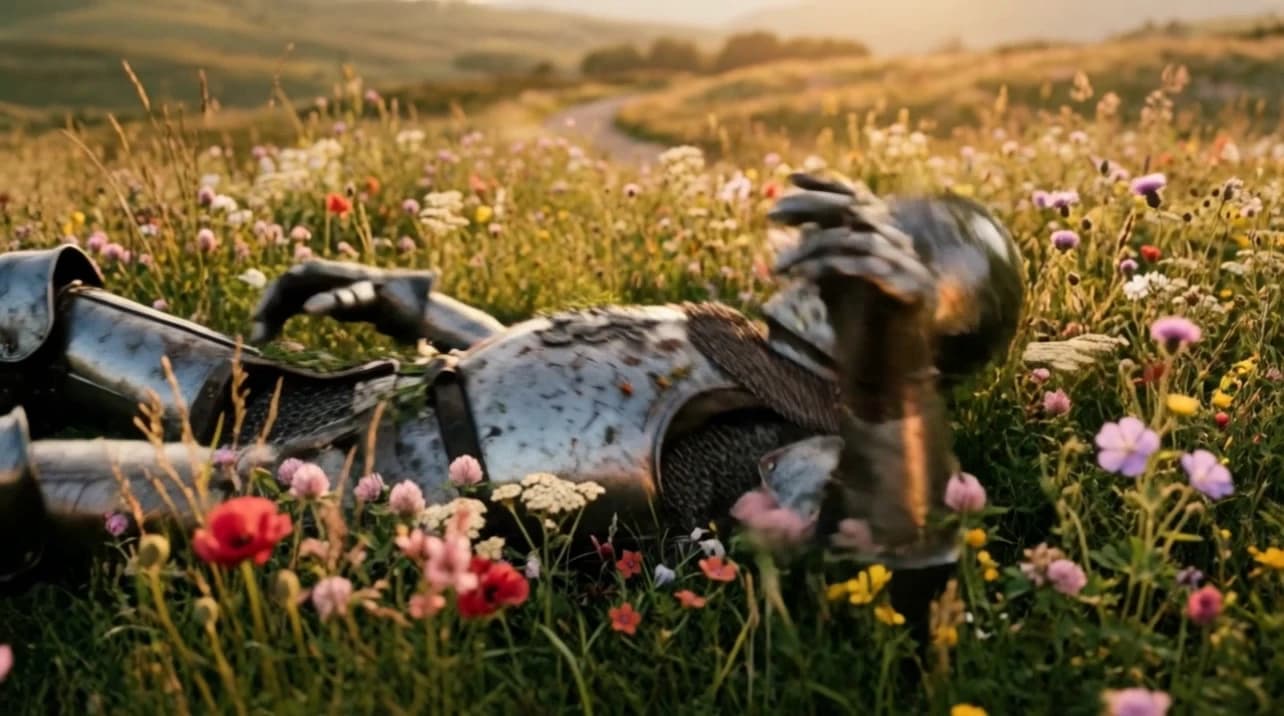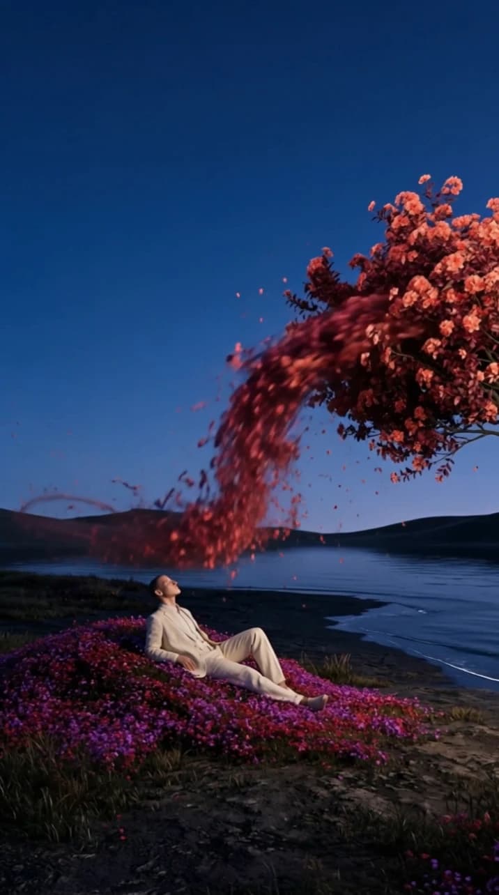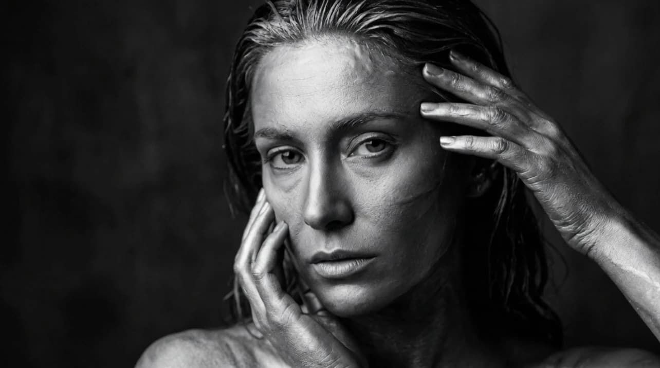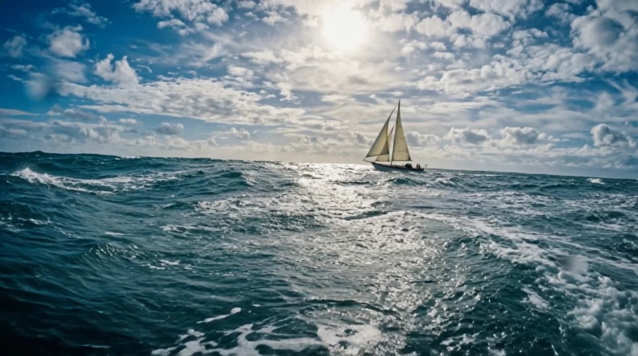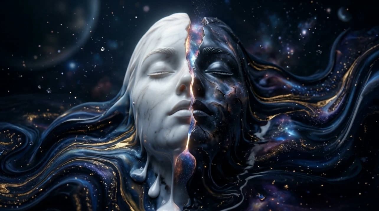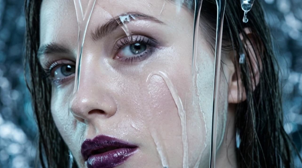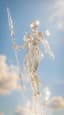 A celestial humanoid entity made of translucent liquid glass and pale champagne-gold light floats against a bright soft-blue sky with delicate clouds. Streams of water and transparent liquid ribbons flow continuously around the figure, swirling around the torso, shoulders, arms, and legs as if alive, with tiny droplets suspended in the air and sparkling in the sunlight. The entity slowly and powerfully spreads its arms wide to the sides in a grand, commanding motion, as if fully embracing and controlling the force around it, radiating dominance, divinity, and absolute power. The crystal spear remains in one hand or drifts elegantly with the motion, while the body posture becomes open, majestic, and triumphant. Bright star-like reflections flash across the liquid surface, water curls and splashes react to the movement, cinematic godlike atmosphere, graceful but powerful motion, photorealistic, highly detailed, glossy transparent textures, cinematic 4K.