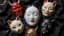 Cinematic still-life shot: several Japanese-style theatrical masks (oni demon masks and kitsune fox masks, plus a smooth white noh-style mask) lying on black silk fabric with elegant folds. The silk subtly ripples as if from a very light breeze, catching soft highlights. Dramatic studio lighting, high contrast, glossy lacquer reflections on the masks, rich texture detail on the fabric, luxurious moody atmosphere. The camera slowly pulls back (smooth dolly-out) revealing a wider composition of all masks on the silk. Shallow depth of field, ultra detailed, realistic materials, editorial product photography look, smooth motion.