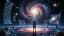Cinematic sci-fi space scene. A lone person stands completely still in the center, facing a giant luminous galaxy suspended in front of them. The galaxy slowly rotates, its spiral arms moving gracefully with glowing stars, nebula colors, and swirling cosmic dust. On both sides of the person, translucent futuristic screens hover in the air, actively displaying shifting data, diagrams, graphs, star maps, and animated interface elements. The person remains motionless, observing the scene. Small planets, asteroids, and distant stars are visible in the background. Epic cosmic atmosphere, ultra detailed, glowing holographic interfaces, soft reflections, cinematic lighting, surreal futuristic mood, smooth slow motion, film look.