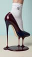A surreal fashion close-up shot of a woman’s foot wearing a glossy high heel and a white sock. The foot slowly lowers down onto the floor, then lifts back up. As the shoe moves, thick glossy slime stretches and pulls from the stiletto heel and the sole, forming long sticky strands connected to the surface. The slime looks viscous, elastic, and shiny, slowly dripping and stretching naturally. The camera remains completely static. Minimal clean studio background, soft lighting, high detail, realistic material textures, cinematic macro fashion aesthetic, smooth motion, elegant and strange luxury editorial mood.
