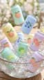 A bright refreshing commercial-style scene with assorted pastel-colored soda cans in soft mint, powder blue, butter yellow, and lilac tones descending and landing into a large glass bowl filled with sparkling ice cubes and chilled water. The cans drop gently but with realistic weight, one after another or together, settling into the ice with crisp splashes, bouncing ice pieces, shifting reflections, and droplets scattering in the air. Condensation glistens on the metal surfaces, fruit illustrations remain visible, and the bowl catches the light with glossy transparent highlights. The camera remains completely static, centered on the bowl, while only the cans, water, and ice move. Clean summer aesthetic, photorealistic liquid motion, bright natural light, highly detailed, cinematic 4K.