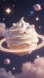 A dreamy whimsical dessert planet floating in outer space. A soft vanilla ice cream swirl slowly rotates in place like a tiny planet. Around it, glowing stars gently twinkle and flicker in the dark sky. Soft pastel clouds drift slowly through the scene. A glowing ring circles the ice cream like Saturn. The camera remains completely static. Magical cosmic atmosphere, soft lighting, pastel colors, glossy creamy texture, tiny candy sprinkles shimmering subtly, cute surreal fantasy style, ultra detailed, smooth animation, dreamy and charming.