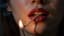 Cinematic beauty macro close-up of a young woman holding a burning match between her teeth. Her glossy lips are slightly parted, and the matchstick is clenched delicately in her mouth. The flame burns steadily at first, then slowly consumes the match, the fire traveling down the wood as the tip chars and glows. Thin wisps of smoke curl upward around her lips and face. She remains almost perfectly still, posing directly to the camera with a sensual, controlled expression. Warm firelight flickers across her skin and glossy red lips, creating dramatic reflections and shadows. Ultra detailed skin texture, cinematic macro lighting, realistic flame, realistic smoke, luxury beauty editorial aesthetic, dark moody atmosphere, shallow depth of field, film look.